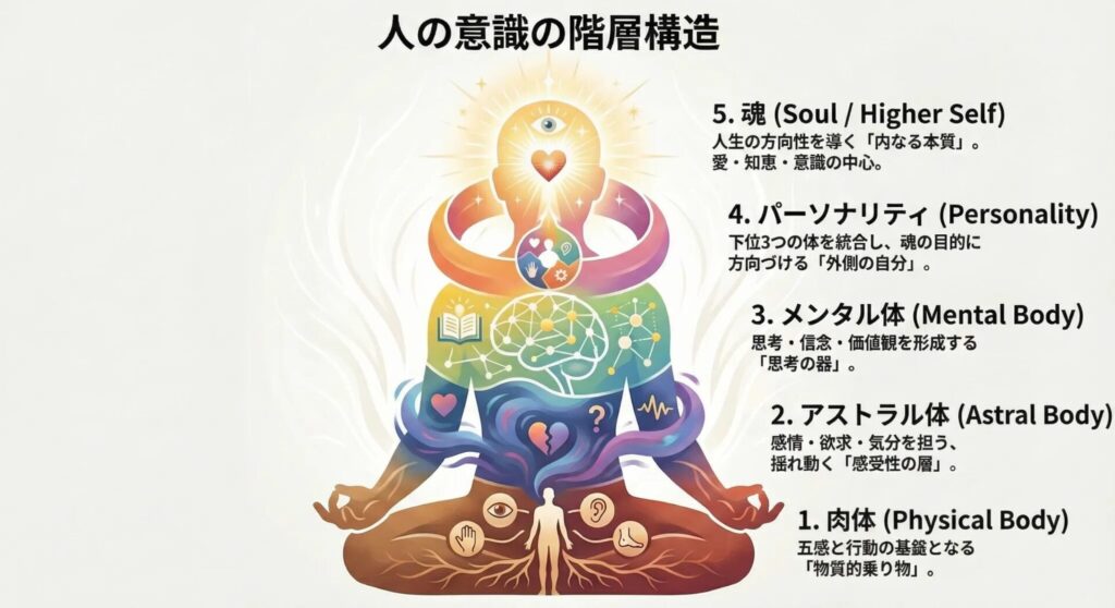 肉体、アストラル体、メンタル体、パーソナリティ、魂(コーザル体)