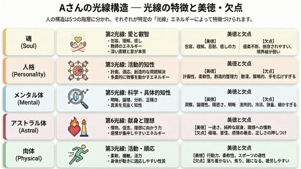 • 魂 = 第2光線(愛と叡智) → 本質的には、愛と理解を通して人を癒し、教えることが使命