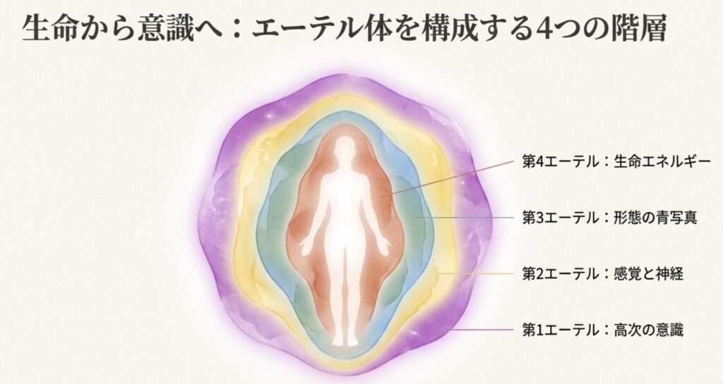エーテル体の4つの亜層は「意識 → 感覚 → 形態 → 生命」をつなぐ階層構造として重なり合っているようです。